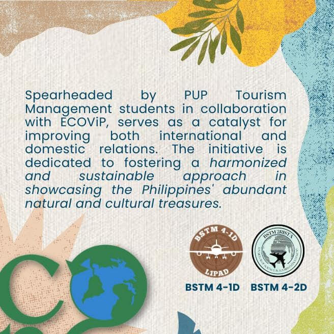 Join us for an enriching conference where exploration meets conservation, and every adventure tells a story.EcoSync is an initiative aiming to integrate environmental sustainability with the tourism industry, fostering a harmonious world. It is spearheaded by PUP Tourism Management students and ECOViP, aiming to improve international and domestic relations. The initiative includes a conference titled "Symphonies of Cultural and Economic Being: Geared Conferences 2024 - Uniting Cultures and Sustaining Futures," showcasing the Philippines' abundant natural and cultural treasures.